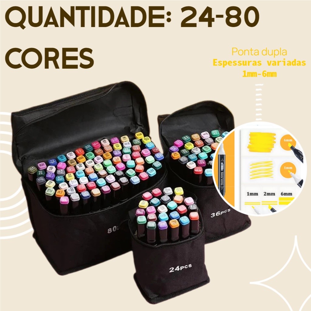 caligrafia Cores vivas – Alta pigmentação, mistura e gradientes perfeitos Tinta à base de álcool – Secagem rápida, resistente a manchas Longa duração – Grande capacidade para uso prolongado ️ Design ergonômico – Confortável para uso prolongado Inclui estojo com zíper – Protege o armazenamento Versátil – Adequado para ilustração, lettering, quadrinhos, cadernos de desenho e muito mais Descrição do produto 24 a 80 cores vibrantes, possibilidades infinitas, liberte sua criatividade! Ainda com dificuldades com a seleção limitada? Nossos conjuntos de 24 a 120 marcadores artísticos oferecem uma ampla gama de cores primárias e complementares. Crie sobreposições impressionantes e misture tons suavemente para adicionar vibração e profundidade sem precedentes à sua arte. ️ Design de ponta dupla para criatividade ilimitada Cada marcador foi cuidadosamente projetado para uso versátil. Por um lado, a ponta fina é perfeita para contornos, detalhes e escrita precisos. Por outro, a ponta angular (larga) preenche rapidamente grandes áreas para uma caligrafia marcante e destaques expressivos. Uma caneta para controle total! Tinta Profissional de Secagem Rápida Experimente o desempenho excepcional da nossa tinta à base de álcool. Ela seca rapidamente, resiste a borrões e permite uma mistura suave de cores e sobreposição perfeita. Suas cores vibrantes e saturadas e durabilidade garantem que sua arte permaneça impecável. Perfeito para todos os tipos de artistas e criativos Seja você um profissional experiente ou um iniciante apaixonado, este conjunto é perfeito para você. Perfeito para: - Ilustradores e cartunistas - Estudantes de arquitetura e design de produto - Entusiastas de lettering e caligrafia - Scrapbookers e entusiastas de DIY - Qualquer pessoa que ame colorir e desenhar! O presente perfeito para inspirar a criatividade Procurando um presente memorável para um amigo, familiar ou para você mesmo? Este conjunto de marcadores vem embalado em uma caixa prática e elegante, tornando-o um presente ideal para amantes da arte em aniversários, Natal ou qualquer ocasião especial. Especificações - Quantidade: 24-80 cores - Dimensões: 16,5 x 10,5 x 10,2 cm - Peso: 0,5 kg - Material: Plástico ABS - Tinta: À base de álcool Conteúdo da embalagem